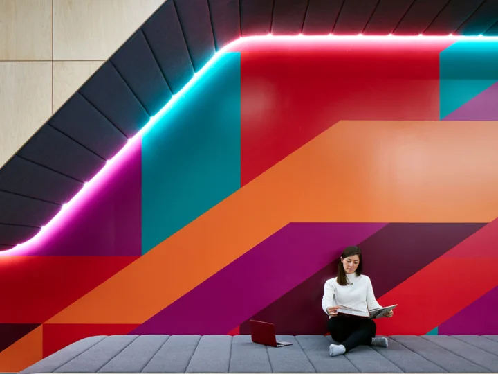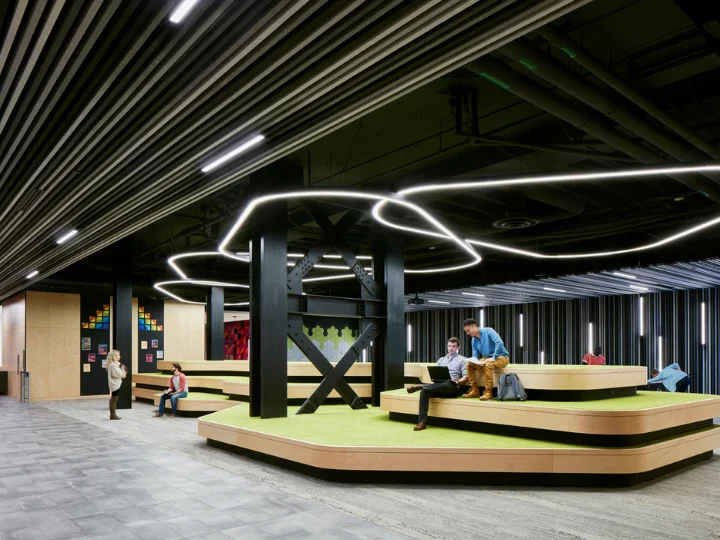 Our lighting design played a crucial role in enhancing Campus1 MTL’s dynamic environment, enriching key communal areas such as the "Inspiration Room" for movie nights and gaming, fitness and yoga studios, a cafeteria, and a games room. The design drew inspiration from the architectural themes of openness, bold geometric forms, and a vibrant color palette. Concealed LED tape lighting highlights recessed seating in the lobby, while staggered suspended linear lights within the felt ceiling system guide students toward the dining area. A striking hexagonal ceiling feature over the à la carte stations and an organic looped fixture in the central communal space emphasize key architectural elements like the exposed steel ‘X’ columns.